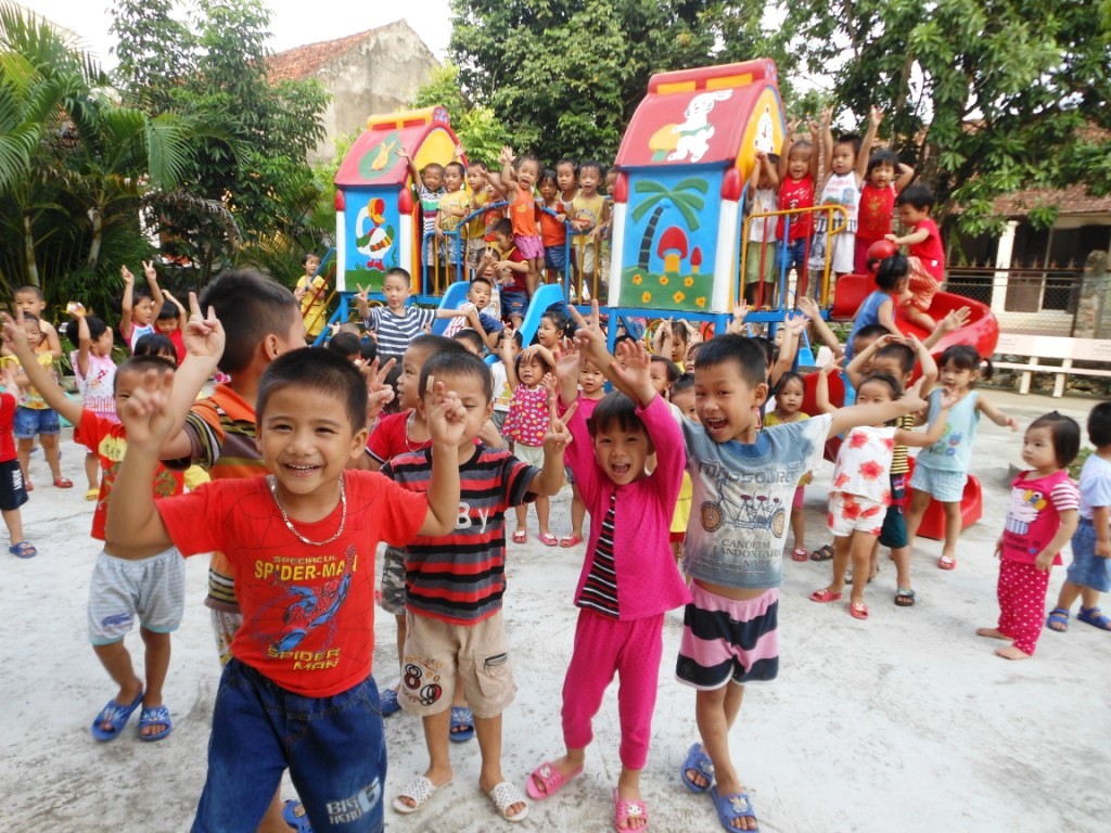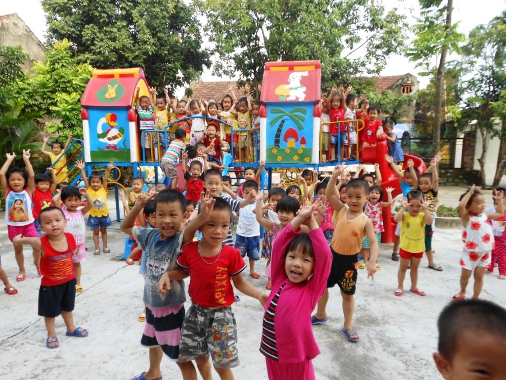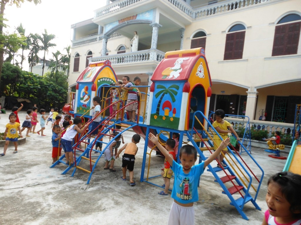 Enfance-Avenir a financé pour un montant de 16 millions de VND le nouveau toboggan de la garderie Mầm Non des Amantes de la Croix à Ngọc Động (province de Hà Nam). Pour que l'attente des enfants ne soit pas trop longue, ce toboggan est triple : deux glissières parallèles ondulées et une glissière hélicoïdale. Succès assuré !